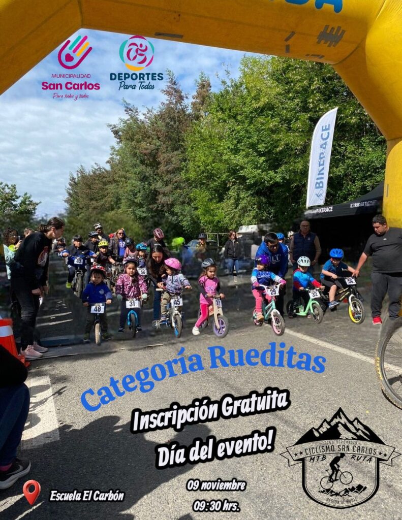 Acompaña al Club de ciclismo San Carlos este domingo 9 de noviembre a una entretenida cicletada preparada para ustedes niños y niñas de la escuela El Carbón.